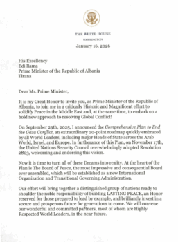Presidenti i Shteteve të Bashkuara të Amerikës, Donald Trump, i ka dërguar një letër zyrtare Kryeministrit të Shqipërisë, Edi Rama, ku e fton Shqipërinë të bëhet Shtet Anëtar Themelues në Bordin e ri të Paqes, një nismë ndërkombëtare që synon forcimin e paqes në Lindjen e Mesme dhe zgjidhjen e konflikteve globale.